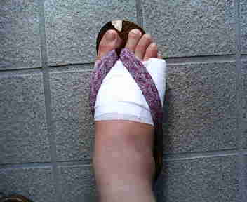 紐の鼻緒みたいな草履はちょうど骨折部分に網目が当たってしまう。